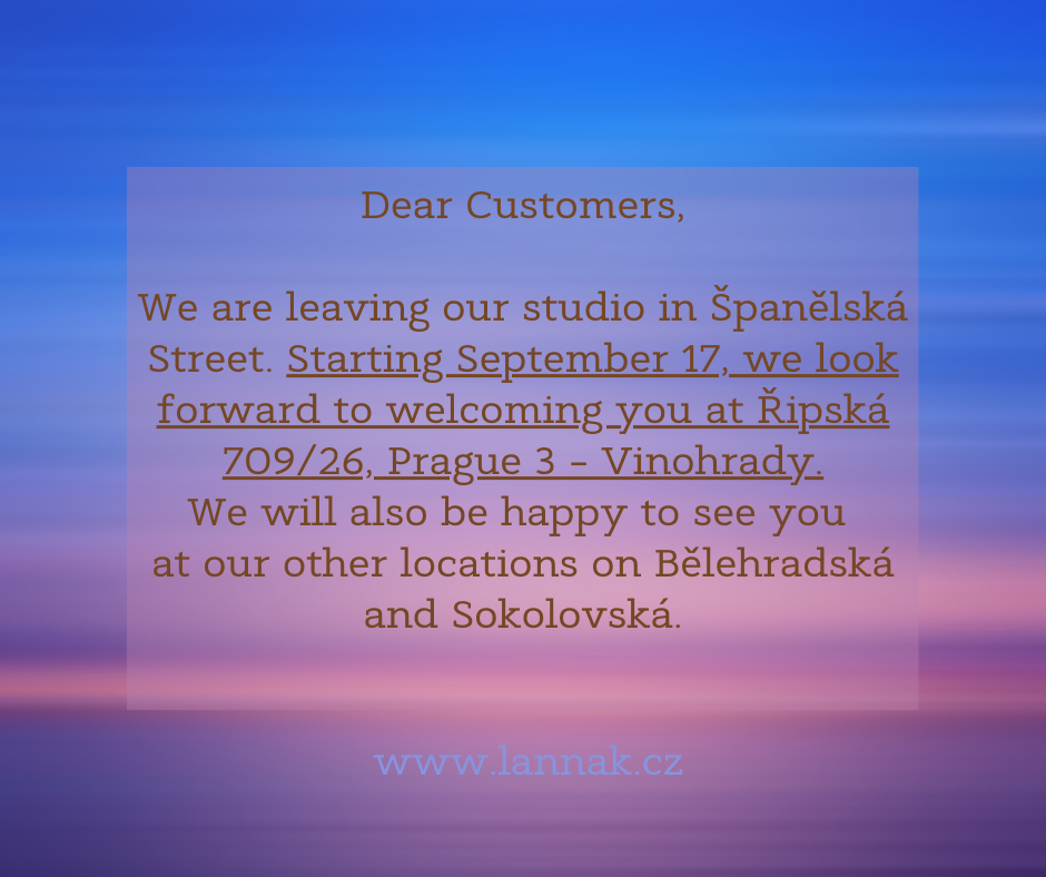 our studio in Slavíkova Street will be on 1.4. closed and we will look forward to seeing you in the month of APRIL at the new address: ŠPANĚLSKÁ 1155/8, PRAGUE 2 Vinohrady.